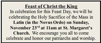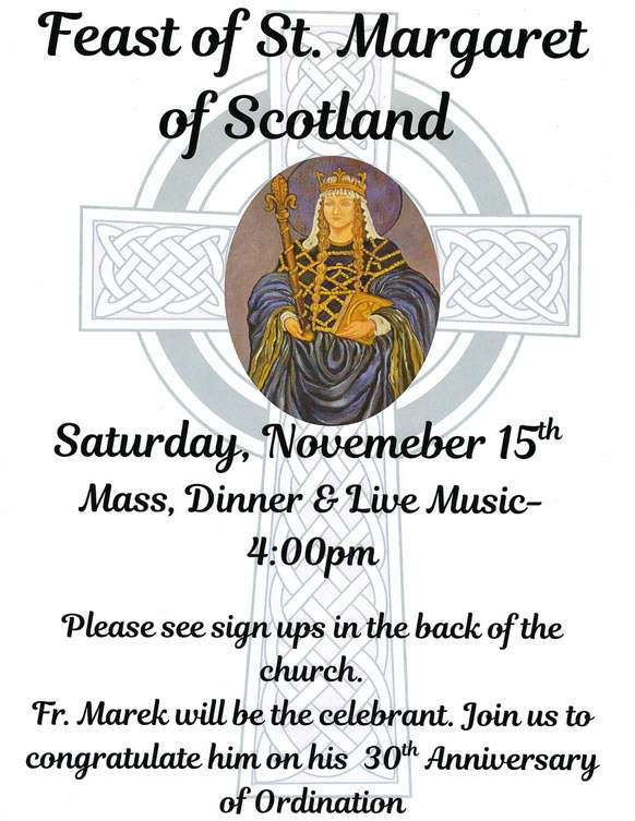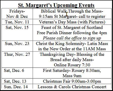 For the Week of November 9th, the Offertory Wine/Altar Bread at St. Margaret's and St. Mary's will be For Our Parishioners