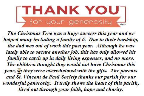 As our “Grand Annual Appeal” is coming to a close, Father George extends his heartfelt thanks to everyone who has stepped forward this year in loving support of our church and all that it does for us and for our brothers and sisters in the community. If you have not yet made your gift this year, please consider doing so now. You can use a contribution card located in the back of the church and drop your gift in the basket at Mass. You can mail your gift to the parish office; or you can give online quickly and securely here on the web. Thanks again for your generosity.