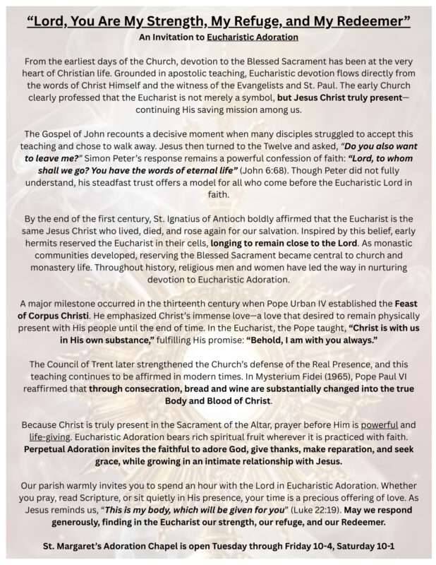 EUCHARISTIC MINISTER TRAINING ..... Eucharistic Minister Training takes place on a pre-appointmet basis at St. Margaret Church. If you are interested, please call the Rectory Office and leave your name and phone number. Thank you.