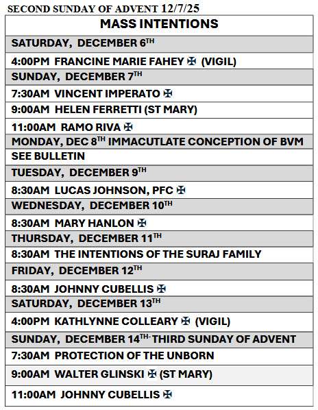 The Mass Book for 2025 is now available. Please call the Parish office to schedule Masses and memorials for the year. Hymnals are also available for dedication. If you would like to book a Mass in memory of a loved one, birthdays, anniversaries or for any other intentions please call the rectory at (508) 759-7777. The suggested stipend for a Mass is $10.00 weekdays, $20.00 for Sundays.